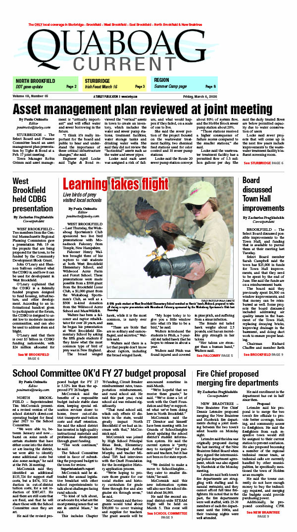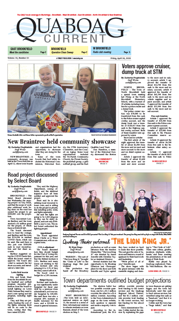 The Quaboag Current is a community newspaper, the ONLY local coverage in Sturbridge – Brookfield – West Brookfield – East Brookfield – North Brookfield & New Braintree. The Quaboag Current is owned by Turley Publications Inc., a local family owned company that has been in business since 1962. We ask for submissions or story ideas and we look forward to informing you about local news and events.